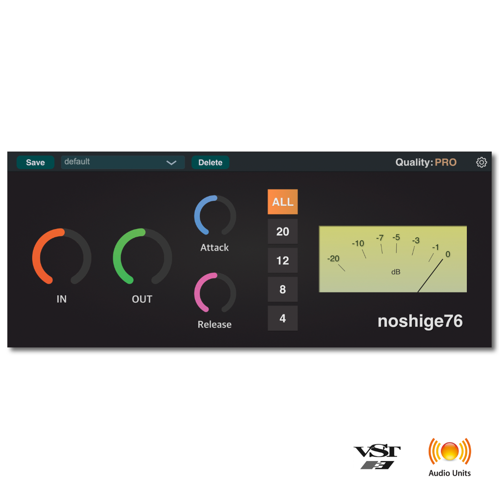 noshige76は、FETコンプレッサーの名機を高い精度で再現し、コンプレッション具合はもちろん、実機に通すことによって変化する音の質感、それによってもたらされる音像の安定性、倍音による心地よさにまでこだわって設計されています。