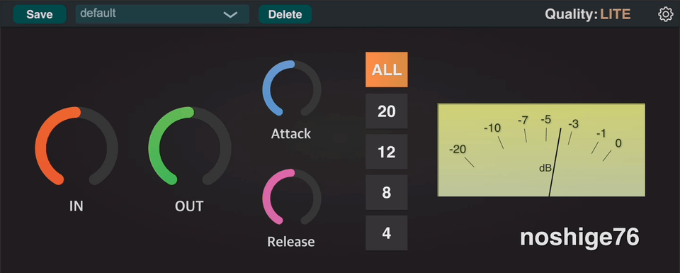 noshige76は、FETコンプレッサーの名機を高い精度で再現し、コンプレッション具合はもちろん、実機に通すことによって変化する音の質感、それによってもたらされる音像の安定性、倍音による心地よさにまでこだわって設計されています。